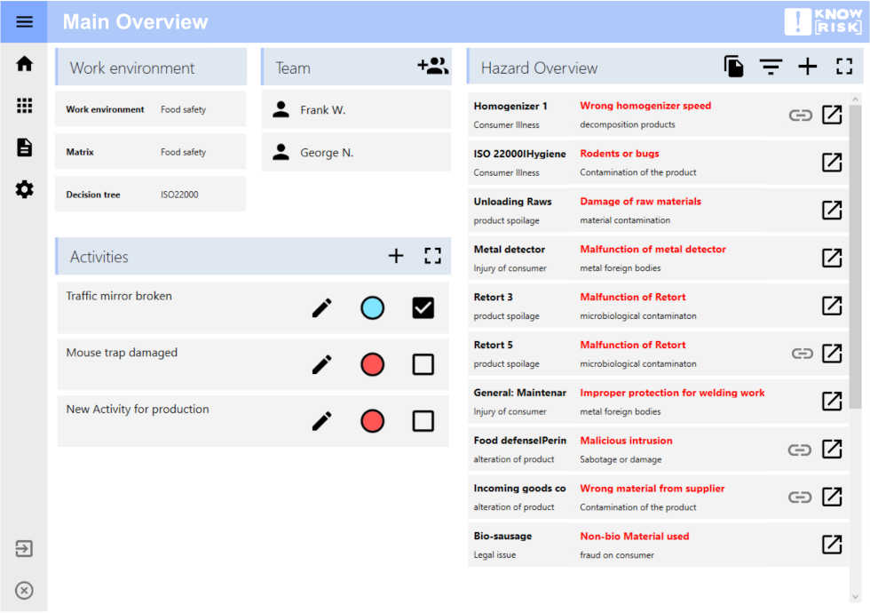 Arbeitsumgebungen erleichtern das Aufteilen von diversen Typen von Analysen. Mithilfe von Filterungen über alle erfassten Gefahren können Sie bestehende Informationen schnell verwalten. Die Auswahl eines Teams verbessert die Nachvollziehbarkeit durch die Aufzeichnung einer Änderungshistorie und das Erstellen von Revisionen.